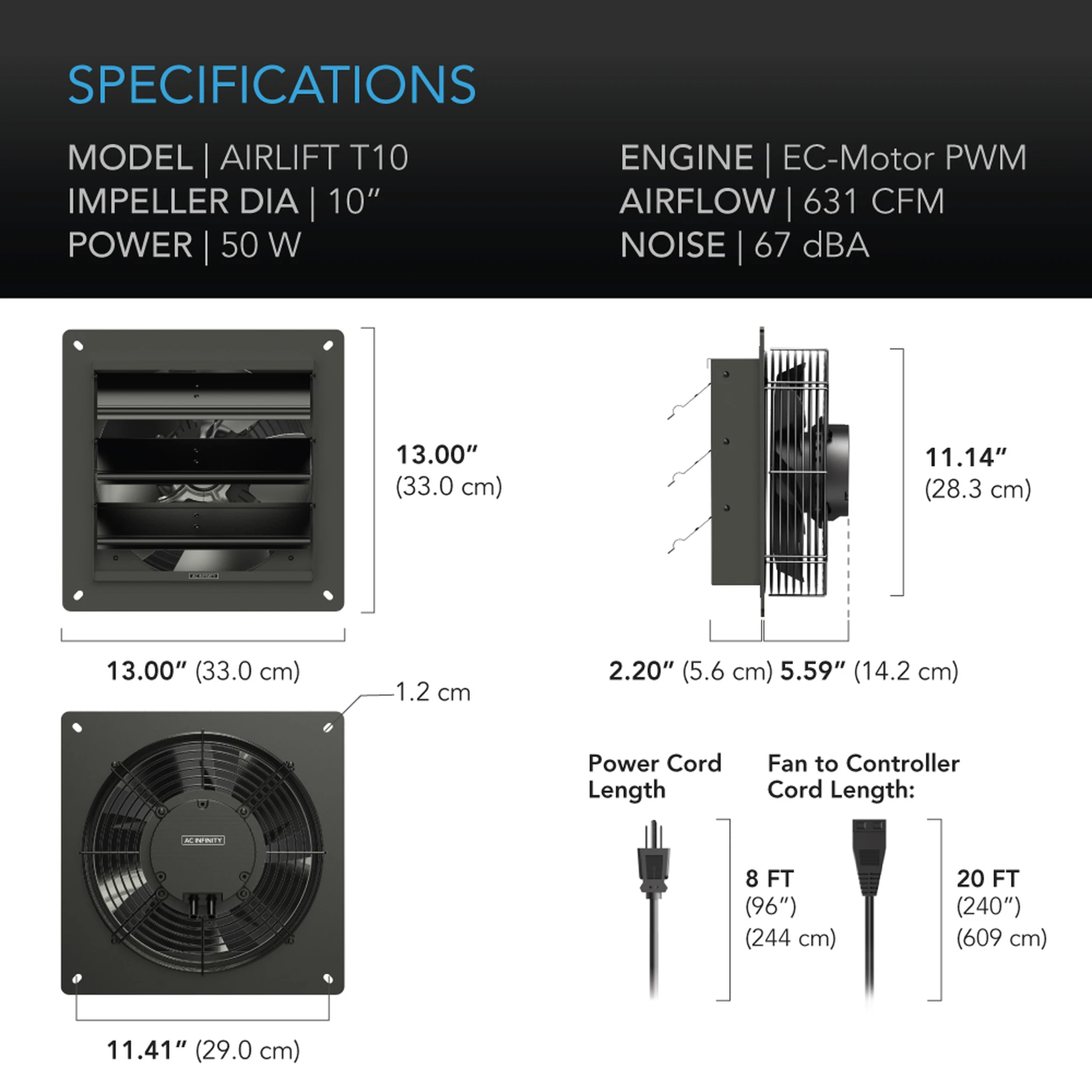 - Fan Size: 10 | Dimensions: 13.0 x 13.0 x 5.9 in. | Airflow: 631 CFM | Noise: 67 dBA | Bearings: Dual Ball