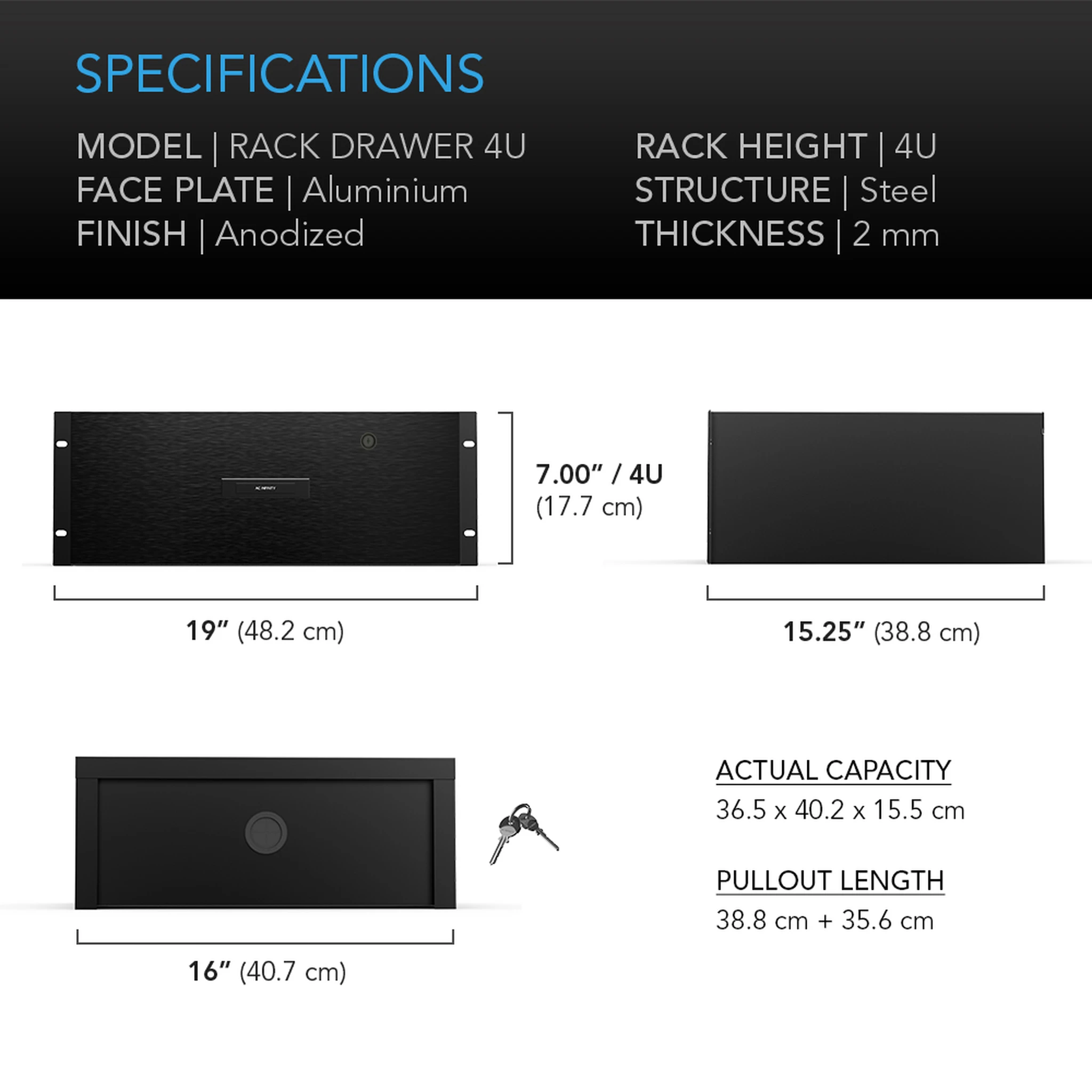AC Infinity AC-RDA4 Heavy-Duty Rack Drawer w/ Faceplate (4RU) is designed to be mounted into standard 19-inch racks to provide storage space. The drawer can securely hold various rack equipment such as cables, headphones, tools, manuals, and microphones. Features a black anodized aluminum faceplate. The remaining sides are fully enclosed using heavy-duty 2mm thick cold-rolled steel with a powder coat finish, and a cable passthrough slot in the rear. This rack drawer takes 4U of rack space and includes a mat and a 10-32 rack mounting screw set.