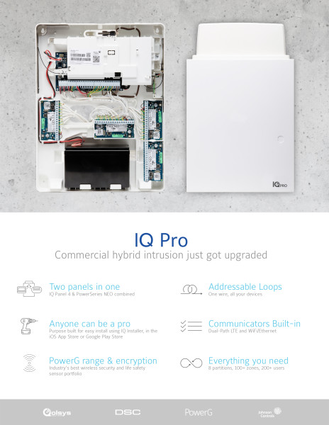 The new IQ Pro, a hybrid panel utilizing the IQ Platform and key features from IQ Panel 4, PowerSeries Neo and customer feedback. IQ Pro will address the needs of commercial, SMB, large residential, campus, and K-12 markets. Building on the IQ Platform, the IQ Pro will support PowerG’s advanced sensor technology with industry-leading wireless range and extensive portfolio of life safety and security devices