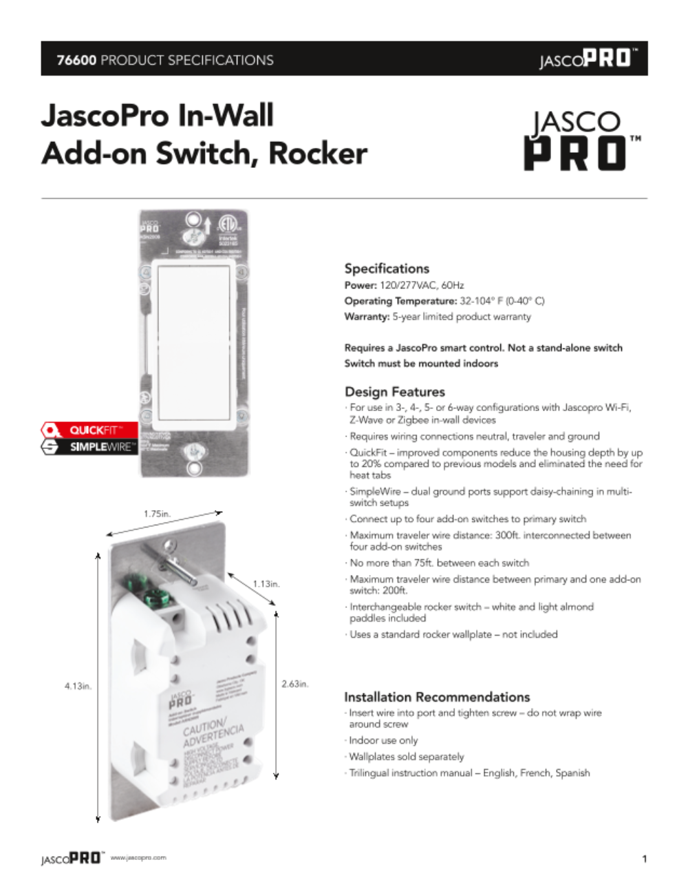 • Compatible with JascoPro Series Z-Wave Plus, Zigbee, and Wi-Fi in-wall devices when paired with a similarly compatible primary switch