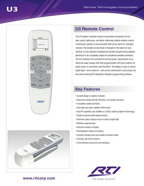 The durable remote floats if dropped in the water for easy retrieval. It uses inductive charging and wireless programming updates, allowing it to be completely sealed for exceptional weather protection. The U3 combines the convenience and low power requirements of an electronic paper display with fully programmable soft-touch buttons for quick access to commonly used functions. The display is easy to read in bright light—even outdoors—and can be customized to each project via the award-winning RTI Integration Designer programming software.